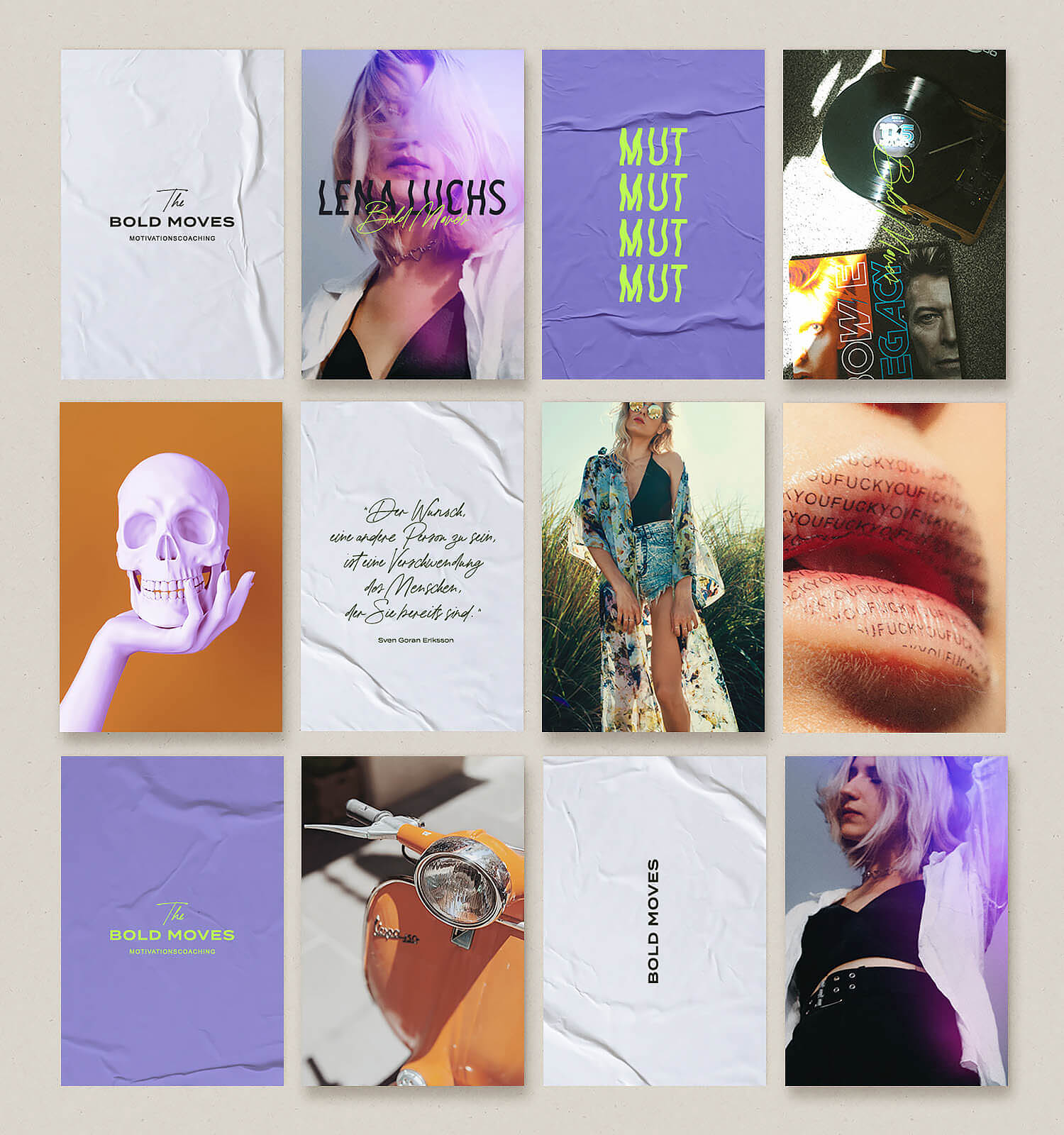 Life Coaches: Salbeigrün, Beige, Off-White. Business Coaches: Navy, Gold, Weiß. Hochzeitsplanung: Puderrosa, Champagner, Mintgrün. Finanzberatung: Blau, Grau, Dunkelgrün.